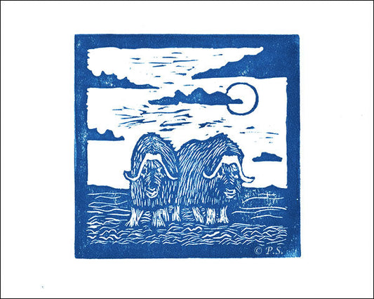 Muskox Blue - Alaska Relief Prints - Hand Pressed